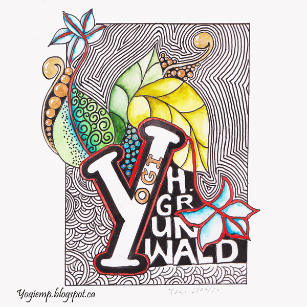 Doodling - Yogi H Grunwald Created: April 6, 2025 size: 4.5" w x 6" h OK... I seem to be a very moody person... not really... so I was drawing the letter "Y" to do artwork around it but I ended up doing my name instead and then the doodling. Done on Canson Pen & Ink paper, Zig Writer, Juice Up pen, Uniball gel pens, watercolors. words: Yogi