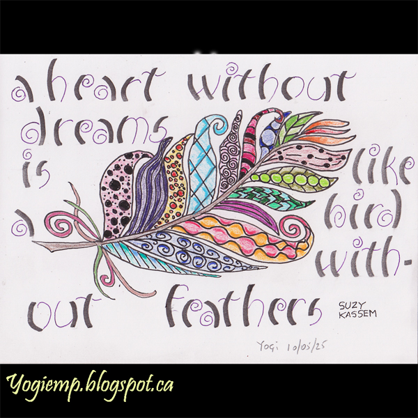 2025 size: 6"w x 4.25"h I was in a mood to play with a feather,,, On Canson Pen & Ink paper using a Zig Writer and a Juice Up pen (purple) as well as a Zig Calligraphy marker, Prisma colored pencils words: