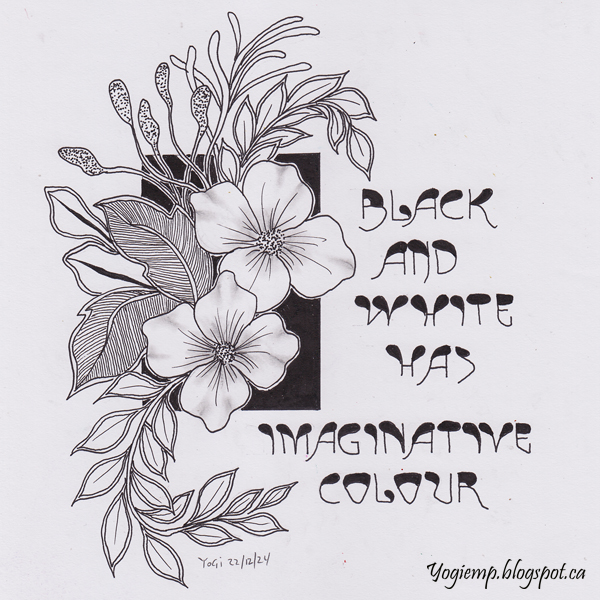 size: 8" sq On Edge Mixed Media paper drew my floral design using a 0.5 Faber Castell black pen adding stippling and linear lines, graphite shading in the flowers. Lettering hand drawn and dark area coloured with an FM Faber Castell pen words: Black and white has imaginative colour |