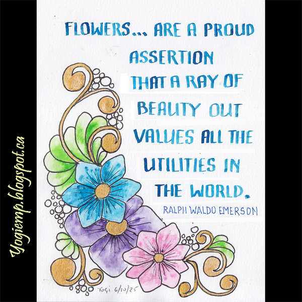 size: 4.25" w x 6" h On Canson Mixed Media paper, created the floral design, painted with various brands of w/c and Gansai Tambi gold paint. Text with a Zig Calligraphy marker (2.0 end) words: Flowers... are a proud assertion that a ray of beauty out values all the utilities in the world. Ralph Waldo Emerson