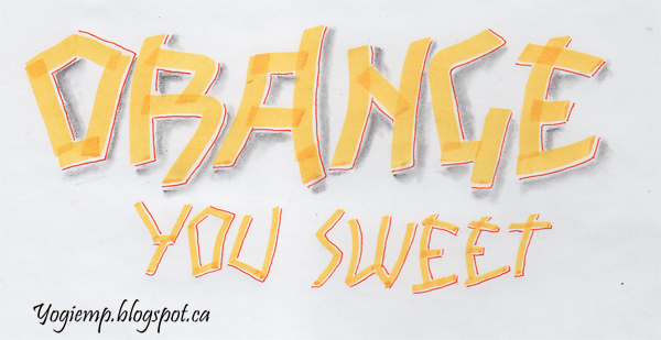 ID: Orange You Sweet Zig (wheat) Calligraphy marker, shadowed with a red Juice Up 0.4 pen. Graphite and paper stump shading. |