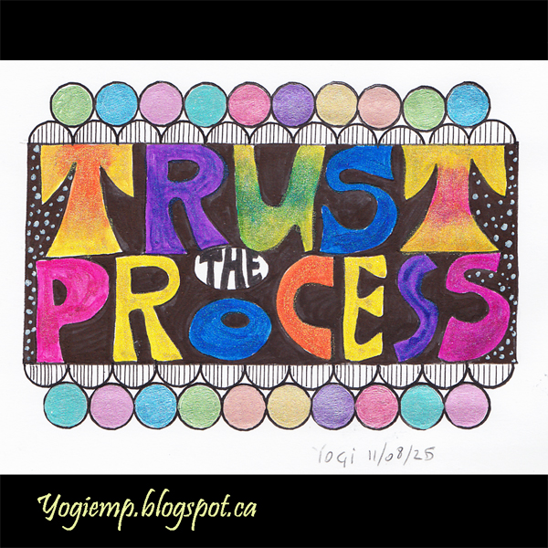 size: 6"w x 4.5"h Just playing... On Canson Pen & Ink paper using all the colors I have of Metallic Gelly Roll pens, words: Trust The Process