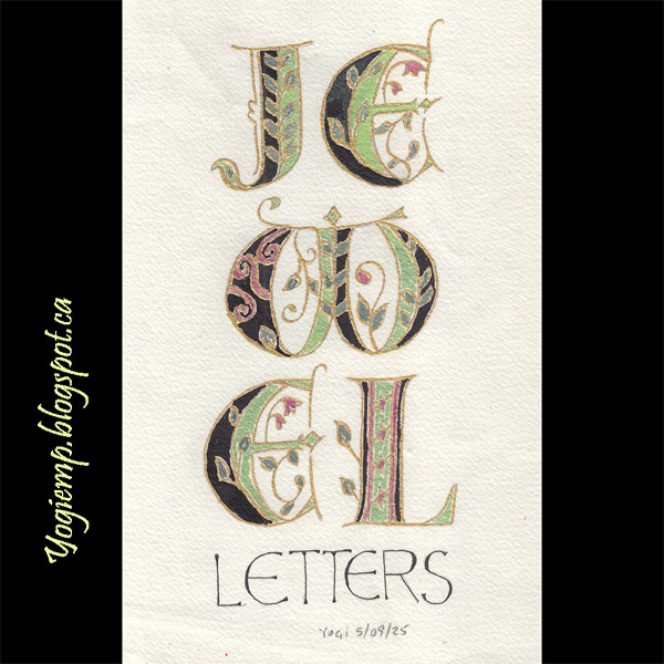size: 8"h x 5"w On Arches Text Wove paper drew out the fancy letters. Inked the outline with Kuretake Gold Mica (Brilliant Gold Ink). Painted with Kuretake Gem colors & Yasutomo watercolors and misc black w/c. The word "LETTERS" done with a Juice Up pen adding slight thicks. words: Jewel Letters