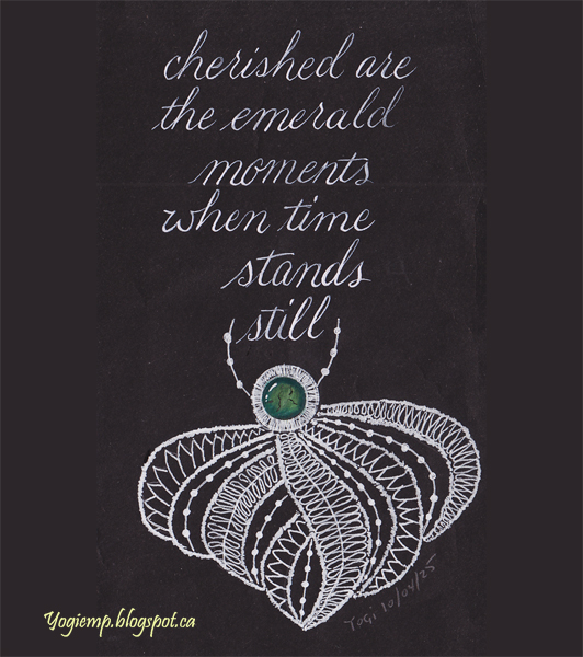 Lace - Emerald Moments Created: April 10, 2025 size: 4" w x 7" h I decided to do another one of those lace drawings I've seen on facebook by (Laurence - Rari Créations - Lace Designs) then found a quote to go with the emerald. Done on photographic background paper. White gel pen and Juice Up pen, Prisma colored pencils. Text with a Nikko G pointed pen nib and FW acrylic ink in a script style. words: