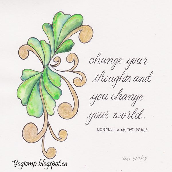 size: 6"w x 6.5"h I was in a doodling frame of mind... Done on Canson Mixed Media paper. Drew out the design with a Zig Writer, painted with some green and blue w/c and Kuretake Gold Mica ink. words: Change your thoughts and you change your world. Norman Vincent Peale |