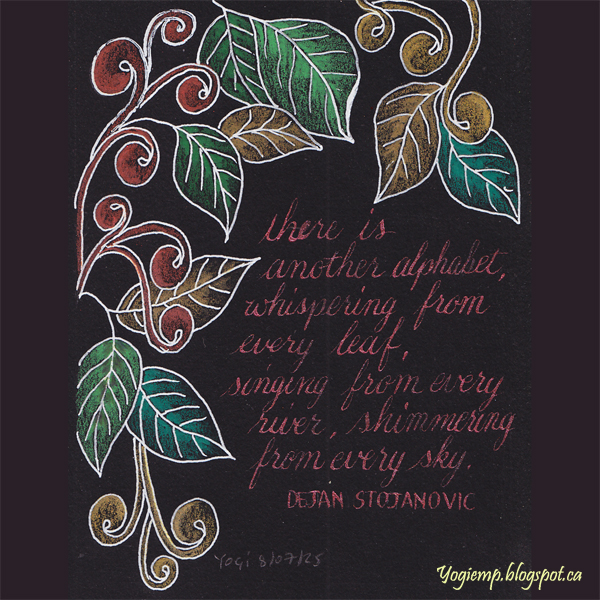 size: 6"h x 4.5"w Continuing using some of my black drawing paper... On Canson XL Black Drawing Paper using a white gel pen and Black Edition colored pencils. Lettering done with a Zebra Pointed pen nib and Twinkles H2º "Indian Copper" words: There is another alphabet, whispering from every leaf, singing from every river, shimmering from every sky. Dejan Stojanovic |