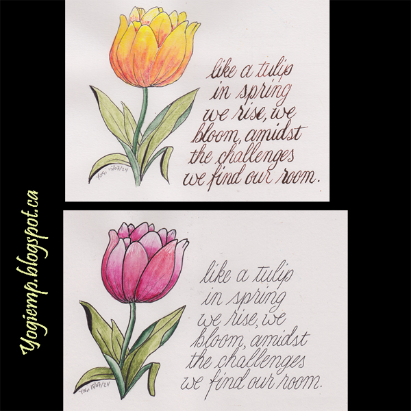 Like A Tulip Created: July 14, 2024 size: 6 sq " each Done on Canson Mixed Media paper. The top one was 1st but my pointed nib with Ecoline ink did not like this paper... Hence the one below also done on the same paper but lettering done with a Juice Up pen... Zig Writer, Derwent Inktense watercolor pencils and white gelly roll pen. words: Like a tulip in spring we rise, we bloom, amidst the challenges we find our room. |