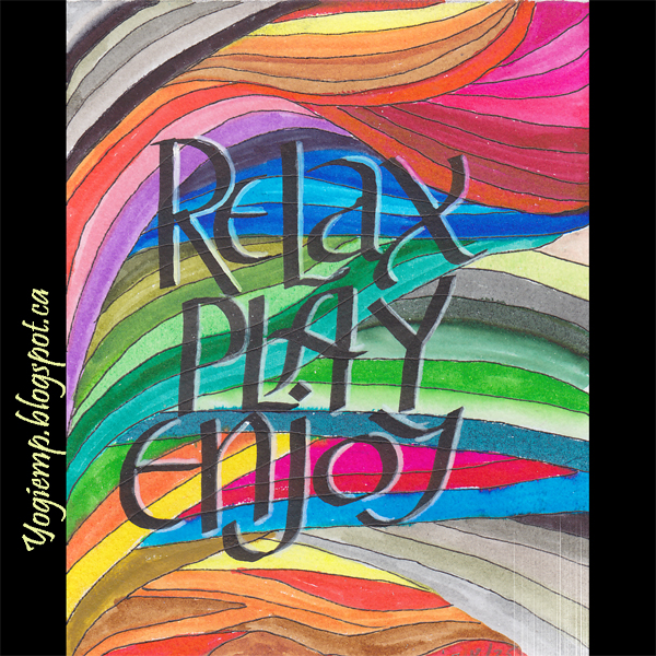size: 6"h x 4.5"w On Canson Mixed Media paper created the bkgr'd with every color of ZIG Clean Color Real Brush pens I have. Then created the black lines to make the colors stand out more. Words done with a black Staedtler Calligraphy Duo pen in my style of lettering adding a white highlight with white paint. words: Relax Play Enjoy