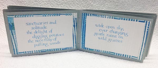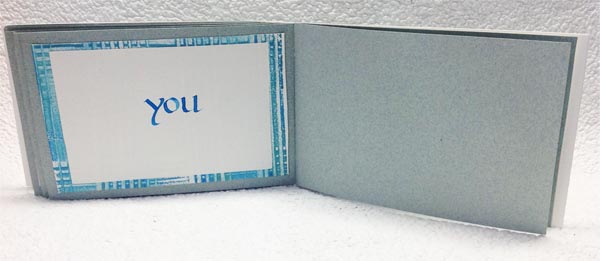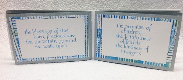 TITLE: Mini Book - YT2 - Blue Arches Text Wove for the hand written text written with a pointed pen or a 2.4 Parallel pen in a Foundational style lettering using Holbien gouache (Peacock Blue mixed with Rich Gold). These pages adhered to a decorative layered Geli print on Text Wove using Golden's Fluid Acrylic (Iridescent Bright Gold) and Stamp Oasis Luna Lights "Blue". A texturing tool used to add the plaid design. This was then adhered to the Canson Ingres (Sky Blue) pages. The book cover and box made from Stonehenge white heavy weight paper and embellished with the Ingres and decorative papers. The book is 6"w x 4"h x 1"thk