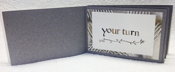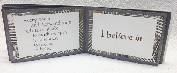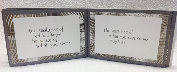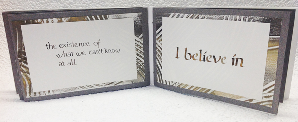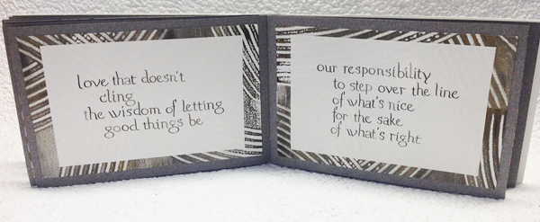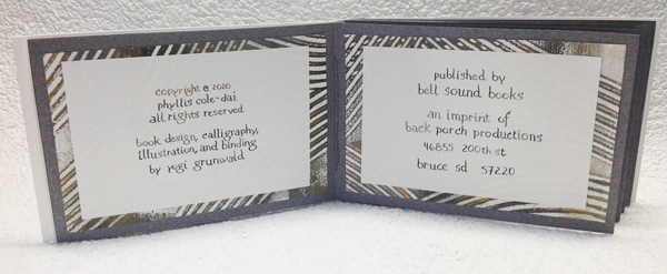 TITLE: Mini Book - YT4 - Black/Gold Arches Text Wove for the hand written text written with a pointed pen or a 2.4 Parallel pen in a Foundational style lettering using a double loading technique - 1st into Black Sumi ink and then into Holbien gouache " Rich Gold". These pages adhered to a decorative layered Geli print on Text Wove using Golden's Fluid Acrylic (Iridescent Bright Gold) and Plaid Folk Art "Metallic Sequin Black". A texturing tool used to add the swirly design. This was then adhered to the Canson Ingres (Steel Gray) pages. The book cover and box made from Stonehenge white heavy weight paper and embellished with the Ingres and decorative papers. The book is 6"w x 4"h x 1"thk
