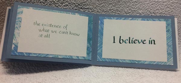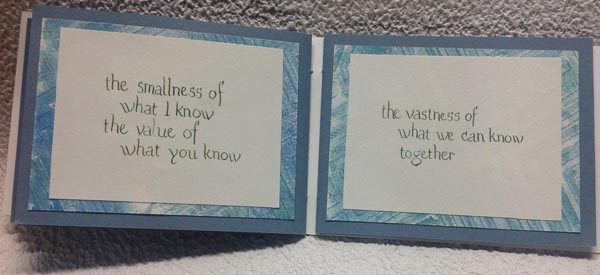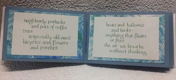 TITLE: Mini Book - YT6 - Blue/Green Arches Text Wove for the hand written text written with a pointed pen or a 2.4 Parallel pen in a Foundational style lettering using Holbien gouache " Peacock Blue" and Rich Gold". These pages adhered to a decorative layered Geli print on Text Wove using Accent "Regency Silver"; Folk Art "Metallic Blue" and "Emerald Green". A stencil used to add the Linear design. This was then adhered to the Canson Ingres (blue CI-68) pages. The book cover and box made from Stonehenge white heavy weight paper and embellished with the Ingres and decorative papers. The book is 6"w x 4"h x 1"thk