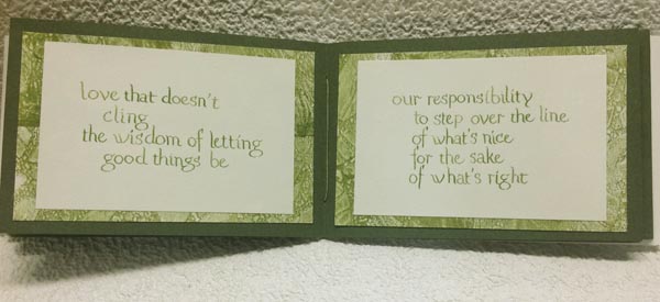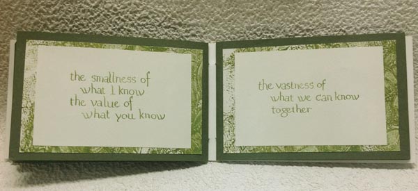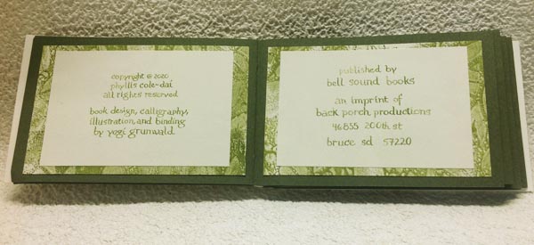 TITLE: Mini Book - YT9 - Green/Gold Arches Text Wove for the hand written text written with a pointed pen or a 2.4 Parallel pen in a Foundational style lettering using Holbien "Prussian Blue" and "Olive Green" gouache with Schminke gold powder. These pages adhered to a decorative layered Geli print on Text Wove using olive green acrylic paint. Stencilled the design using a leaf stencil. This was then adhered to the Canson Ingres (green) pages. The book cover and box made from Stonehenge white heavy weight paper and embellished with the Ingres and decorative papers. The book is 6"w x 4"h x 1"thk
