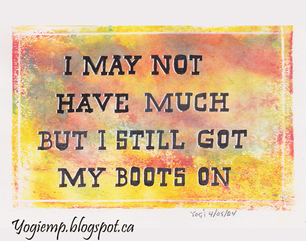 My Boots On Created: May 6, 2024 size: 6"w x 4"h Our next galleria will be "Under the Western Sky" which is the theme for Stampede this year. This was my 1st attempt for the theme... Definitely not happy with my cowboy lettering. Not clean enough... I used another rubber stamp I created of just a plain border, inked with various colors of Distress Oxide pads, misted with water and stamped onto Canson Mixed Media paper (I think...). A ZIG calligraphy pen which I couldn't get the clean lines like with a broad edge nib... Highlighted with a white Juice Up pen. words: