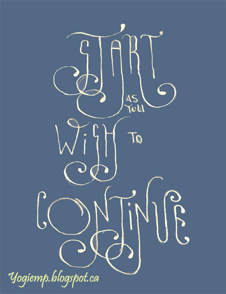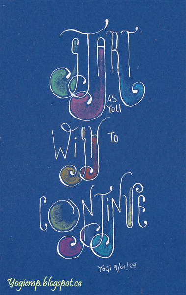 12, 2024 size: 3`wx 6"h On dark blue cardstock and using Bleed Proof white ink and pointed pen wrote out the text in a Neo Orient Type lettering. Colored with Black Edition colored pencils. Words: Start as you wish to continue. This is the January prompt for the Idaho CalligraphynGuild.