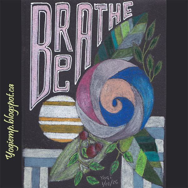 1, 2026 size: 4.5"w x 6"h On Canson Black Drawing Paper using Prisma colored pencils for the abstract artwork, white Gelly Roll 10 pen for the word outline and US Art Quest Mica Color "Pastelle" paint for the word words: Breathe |