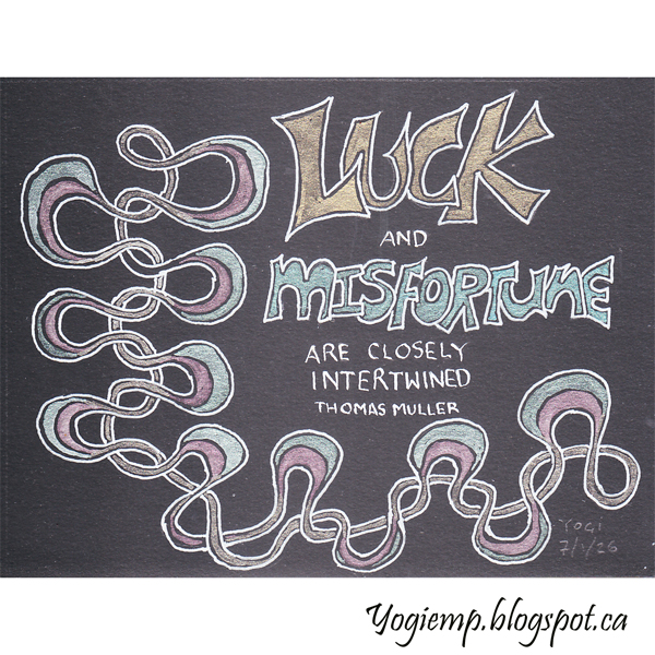 9, 2026 size: 6"w x 4.5"h On Canson Black Drawing Paper using a Gelly Roll white gel pen created the funky border. Painted with US Artquest Mica Color "Interference" set words: Luck and Misfortune are closely intertwined. Thomas Muller |