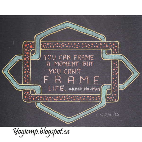 9, 2026 size: 6"w x 4.5"h On Canson Black Drawing Paper using a Uniball Gold gel pen created the funky intertwined border. You'd ever know what looks like a blue border is real and beautiful green... go figure painted with US ArtQuest Mica Interference paint. Text written with a pointed nib. words: You can frame a moment but you can't frame a life. Armin Houman |