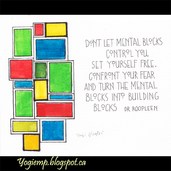 size: 6.5" w x 5.5" h On St Armand w/c paper, painted my blocks with various brands of w/c. Outlined with a Zig Writer and Sharpie pen. Text written with Juice Up words: Don't let mental blocks control you. Set yourself free. Confront your fear and turn the mental blocks into building blocks. Dr Roopleen