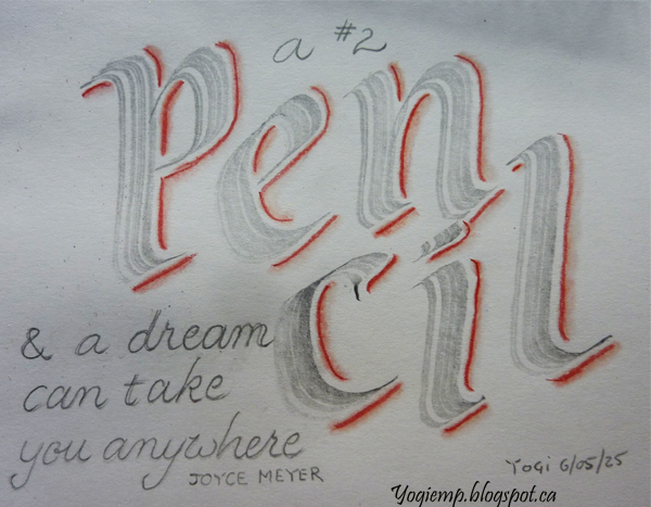 2025 size: 6"w x 4.25"h I was in a mood to use one of my wide graphite pencils (Lyra 2B) On Canson Mixed Media paper Drew out the word "Pencil" and then shadowed with a red Prisma colored pencils and paper stump. Then wrote out the rest of the quote with a Caran d'Ache #2 pencil. words: