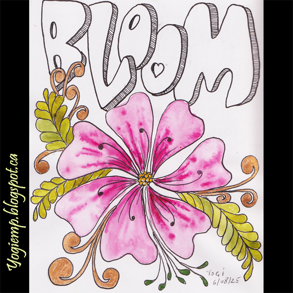 size: 4.5"w x 6"h I was playing with the gals again and created a few pieces... 2 of which I totally finished. This is one of them. On Canson XL Pen & Ink paper drewout my flower and inked with a Zig marker. Painted various brands of w/c's'. Added the word BLOOM and hatched with a Juice Up pen. words: Bloom |