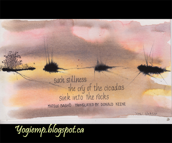| Scenic Scene - Haiku - Such Stillness Created: July 5, 2024 size: 8.25"w x 5"h I came across this background I made eons ago and finally decided to put something on it. I really love the way this background evolved - serendipitously On an unknown mixed media (blotches and touch of rubber stamping and wet on wet technique. Haiku written with a Juice Up pen words:
