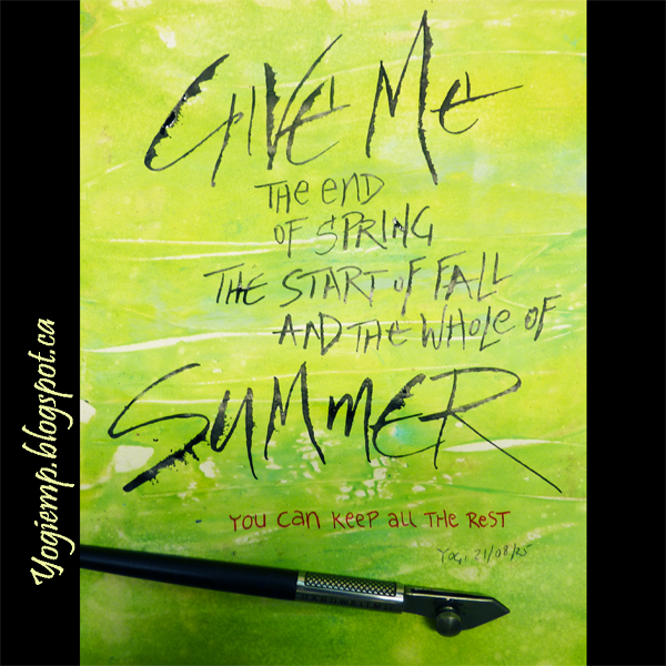 ID: wk 34 - Summer - Give Me Summer Gelli Print on Columbia Mills LBS End Paper using a Brody Handwritmic pen and Sumi ink wrote out my own words... words: Give me the end of spring the start of fall and the whole of summer. you can keep all the rest.