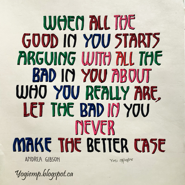 ID: wk 35 - Andrea Gibson- Better Case Size: 8"w x 8.5"h On Genoa Bond Calligraphy paper wrote out the text using various colors of Elegant Writer Calligraphy pens in a Art Deco style. Shadowed each letter with a ZIG Writer. words: When all the good in you starts arguing with all the bad in you about who you really are. let the bad in you never make the better case. Andrea Gibson