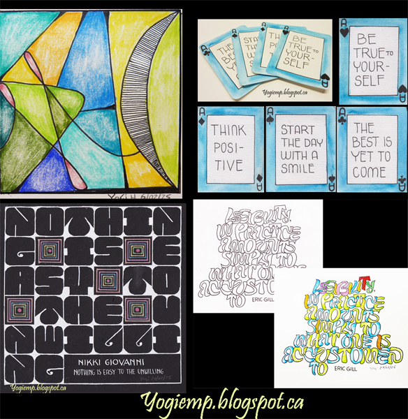 ID: wk 8 - Nikki Giovanni - Nothing Easy On Black cardstock created the lettering (Art Nouveau style) and with a Uniball white Gel pen inked in the negative areas. With various colors of Gelly Roll metallic pens created the spacer boxes. Added the authors name and a more readable version of the quote for some...