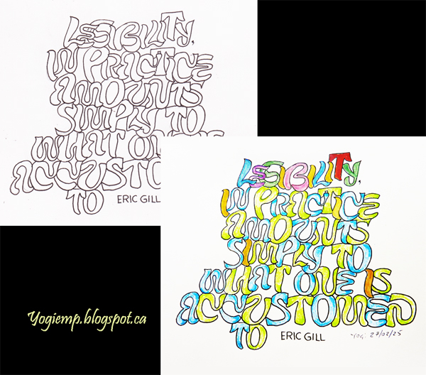 ID: wk 9 - Legibility Size: 6.5"w x 6"h On Canson Pen & Ink paper drew out my funky letters using a Zig Writer. Used watercolors for the title, Kuretake gold paint for the "i's" and Prisma colored pencils for the rest. words: Legibility, in practice amounts simply to what one is accustomed to. Eric Gill