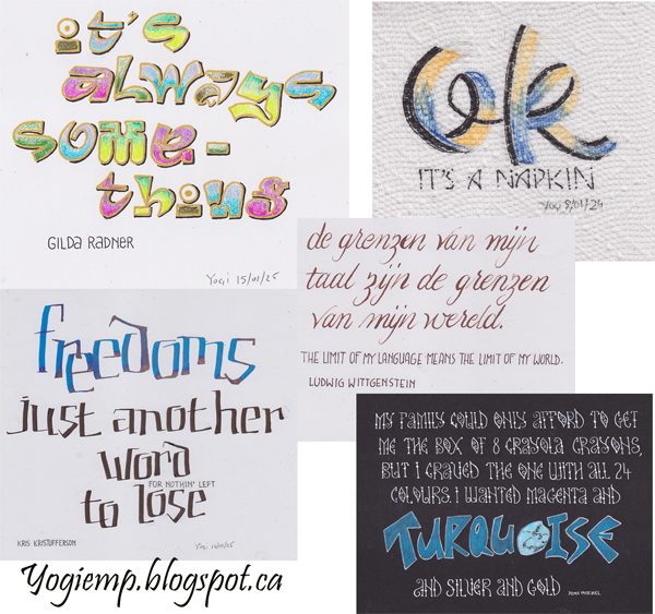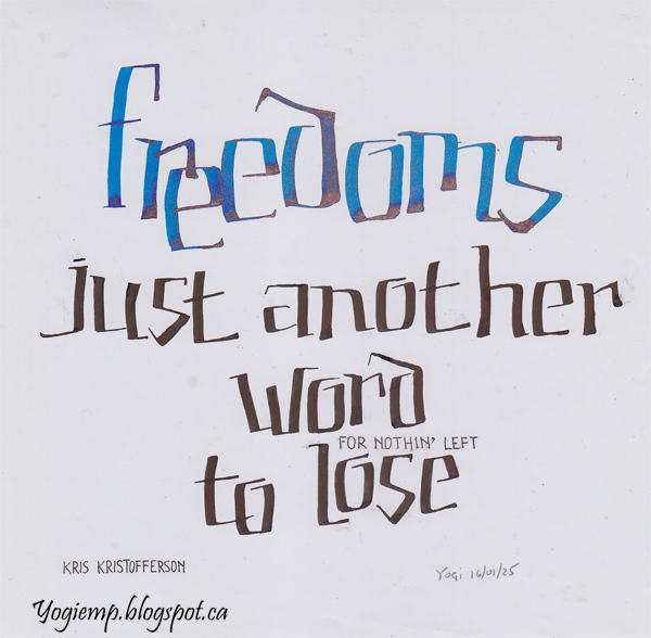 ID: wk 3 - Emotion - Freedoms Size: 8"w x 7.5"h On Canson Marker paper wrote out the words with 2 sizes of Parallel pens (3.8 & 3.0) and a Juice Up pen in a funky style. Large pen with de'Atramentis Cyan Blue/Copper ink, smaller letters with a Pilot black cartridge and a Juice up pen for the tiny letters... words: Freedoms just another word for nothing left to lose. Kris Kristofferson |