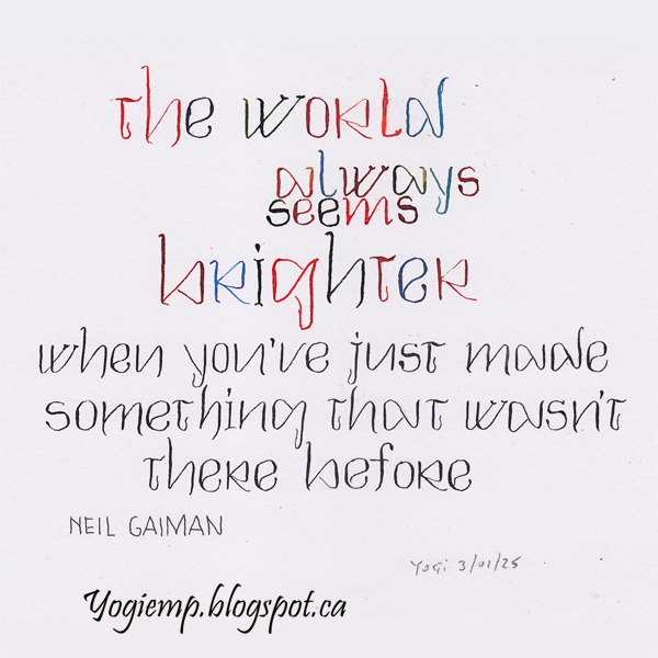 Gaiman Quote On Fabriano Mixed Media paper (I love this paper...) wrote out the quote using a Zebra pointed pen nib, Ecoline inks and Sumi ink in a Blue Rider font style. words: the world always seems brighter when you've just made something that wasn't there before. Neil Gaiman |