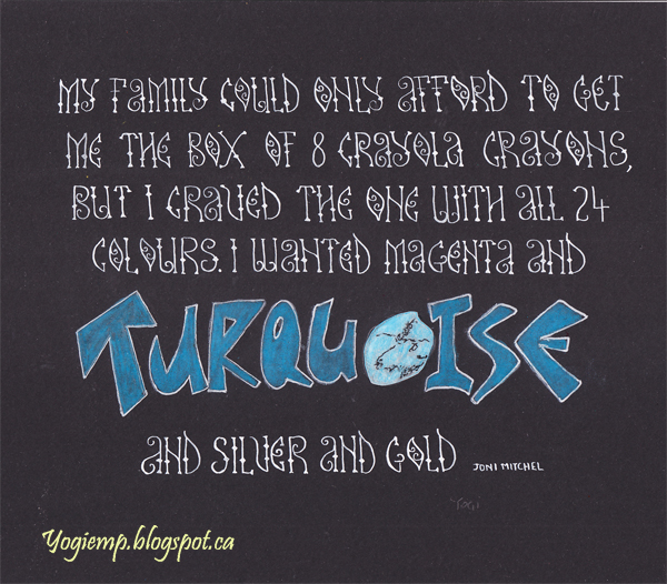 Gem - Turquoise Created the gem artwork and cut it out using it as my "o" for my gem name. On black scrapbook cardstock drew my main word coloring with Black Edition colored pencils and a Gelly Roll white gel pen. Quote written in Fickle lettering style with Bleed Proof white and Zebra nib. words: My family could only afford to get me the box of 8 crayola crayons, but I wanted the one with 24 colours. I wanted magenta and turquoise and silver and gold. Joni Mitchel