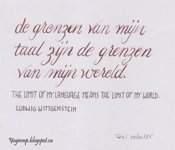 Language - Flemish Created on Canson Mixed Media paper using Holbien gouache (mix of Burnt Umber, Dk Green & Pearl Copper) with pointed pen script lettering. Translation in monoline. Quote: The limit of my language means the limit of my world. Ludwig Wittgenstein translated into Flemish: de grenzen van mijn taal zijn de grenzen van mijn wereld |