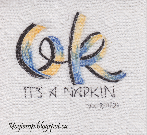 ID: wk 2 - Napkin - OK On a misc napkin using Artistro Brush paint pens (blue & yellow) and a black Zig Writer. Funky OK and Dot lettering for text. PS the date looks like 24 but is 25 with some part didn't scan right... words: OK it's a napkin |