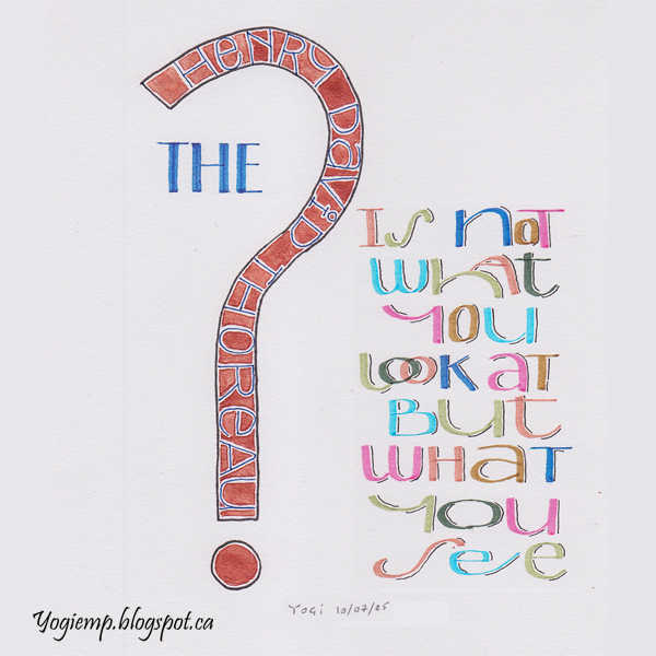- HD Thoreau - The Question On Canson XL Mixed Media paper drew out the question mark symbol (for the word "question") and inserted the author's name. Since someone mentioned H2O's I pulled out mine and used the "Indian Copper" to paint around Henry's name written with a Unibal Signo .38 deep blue pen. Then wrote the text around it with various colors of Zig and Itoya Calligraphy markers then shadowed with a black .02 Micron pen. words: The question is not what you look at but what you see.