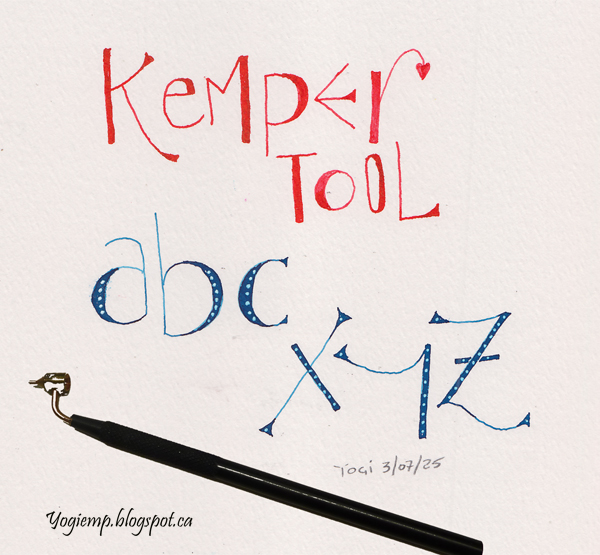 Kemper I have to say I don't have ANY tool in my home I haven't used at least once. As soon as it comes into my home I have to try it either to make sure it works or to have fun trying something new... BUT thanks for getting me to play with it again... On Strathmore Watercolor 140# paper using a Kemper tool with Higgins fadeproof red ink & Ecoline Prussian Blue ink. Dots added with Winsor & Newton white ink for dip pens. words: Kemper Tool abc xyz
