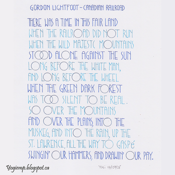 Lightfoot On Edge Sketchbook paper wrote out part of Gordon Lightfoot's song (Canadian Railroad Trilogy) using 3 colors of blue Juice Up pens in skinny monoline with exaggerated "O's". words: There was a