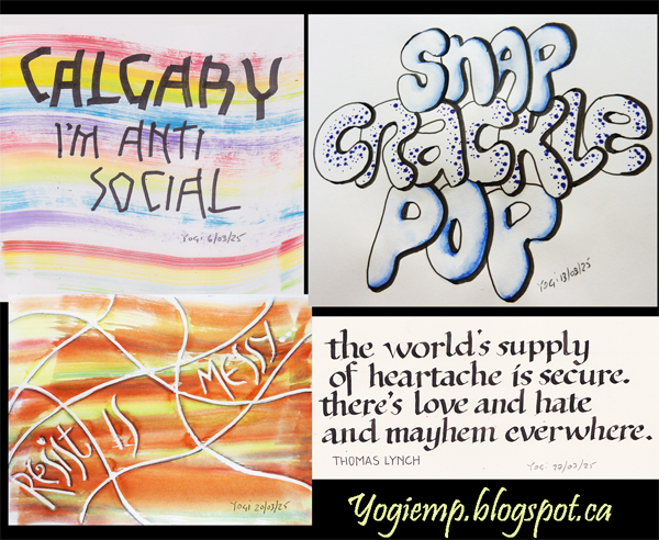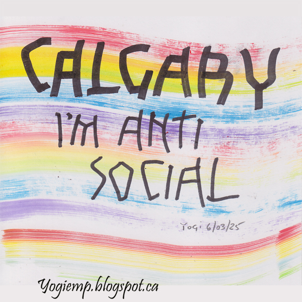You On Canson Pen & Ink paper created the wavy lines using a new brush I just bought... The Palmer by Dynasty 2" synthetic shader. I dampened the bristles and patted dry with a paper towel. Dotted the tip with Magic Color inks in the rainbow colors, then created the wavy lines. Calligraphy done with both sides of an Itoya Doubleheader black marker in Lisbet's ZEEP interpretation. The words describe me perfectly... words: Calgary I'm anti social |