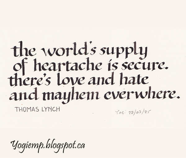ID: wk 13 - Thomas Lynch - World's Supply Size: 6.5"w x 3.5"h On Genoa Bond paper using a Mitchell 2 nib and Sumi Ink in a Foundational style lettering. words: the world's supply of heartache is secure, there's love ad hate and mayhem everywhere. Thomas Lynch