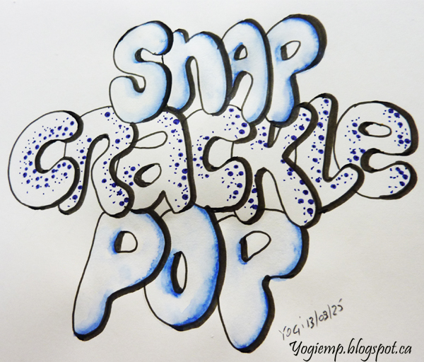 - Tricolon - Snap Crackle Pop On Canson Mixed Media paper drew out the bubble style letters. Outlined and shadowed with a black Zig Writer. Colored with a Derwent w/c pencil (ultramarine 29) and moved color around with a loaded wet brush. Stippled the center one with a blue Zig Writer. |