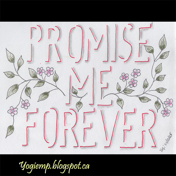 1, 2026 size: 6"w x 4.5"h On Canson Mixed Media paper drew out the words using the shadow technique using a red ZIG Writer and graphite shadow, then added the floral design to give a bit more interest using Prisma colored pencils. words: Promise Me Forever