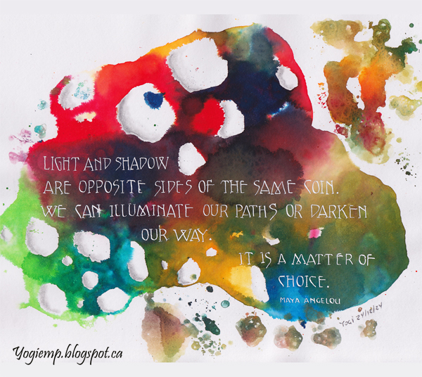 size: 9.5"w x 7.75"h I was in a mood to do some soap bubble blowing artwork... As I found out adding too much color on the large bubbles creates big blobs when the sink to the paper... On Fabriano Mixed Media paper using water with soap detergent blew bubbles and then transferred them to my paper, dropping some of the Ecoline inks onto the bubbles (Lt Green, Sky Blue Cyan, Scarlet, Dp Yellow). When dry, added graphite shadows blending with a paper stump in the large holey areas... Quote written with a Brause 515 nib and Bleed Proof White ink in a pointed pen Bookhand style. words: Light and shadow are opposite sides of the same coin. We can illuminate our paths or darken our way. It is a matter of choice. Maya Angelou |