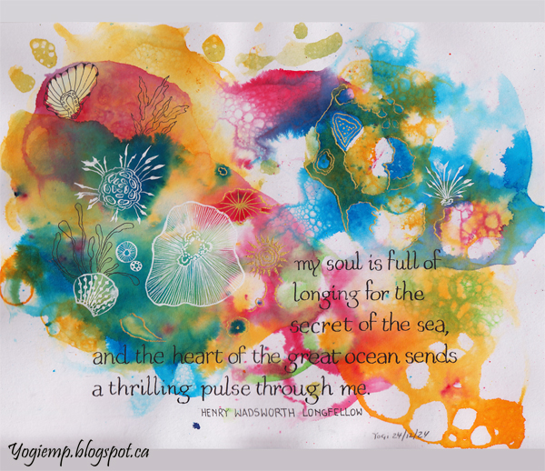 size: 10"w x 7.75"h I was in a mood to do some soap bubble blowing artwork... As I found out from the first piece I did I had to be careful not to drop too much ink onto the bubbles or I'd get no bubbles and a bunch of solid blotches... On Fabriano Mixed Media paper using water with soap detergent blew bubbles and then transferred them to m paper, dropping some of the Ecoline inks onto the bubbles (Lt Green, Sky Blue Cyan, Scarlet, Dp Yellow). When dry, doodled with white and gold gell pens and Juice Up pens and some Bleed Proof white ink with a pointed nib. Quote written with a Zebra nib and Sumi ink in a pointed pen foundational style. words: My