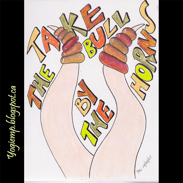 size: 4.25"w x 6"h On Canson Mixed Media paper using a ZIG Writer and Prisma colored pencils. words: Take The Bull By The Horns |