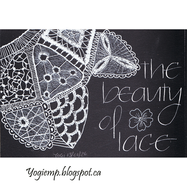 17, 2026 size: 6"w x 4.5"h On Canson Black Drawing Paper using a white gel pen and a Juice Up pen created the lace design. Text written with a pointed nib and Bleed Proof white. words: The Beauty of lace. |