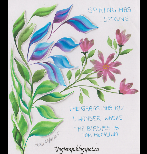 2025 size: 4.5"w x 6"h I was at our Guild's play day this past Saturday and created a bunch of things... this was the 2nd piece - I felt like playing with one of my triangle brushes - the smallest one. On Canson Mixed Media paper created the leaves and flowers, added graphite shadow. Text written with a med blue Juice Up pen in a basic monoline. words: Spring has sprung the grass has riz I wonder where the birdies is. Tom McCallum