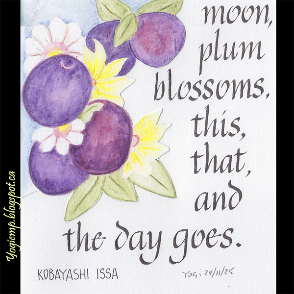 size: 6"h x 4.5"w On Canson Mixed Media paper painted the plum design with various brands of w/c. Wrote out the haiku text with a Staedtler 3002 pen size 2.0 words: moon, plum blossoms, this that, and the day goes. Kobayashi Issa