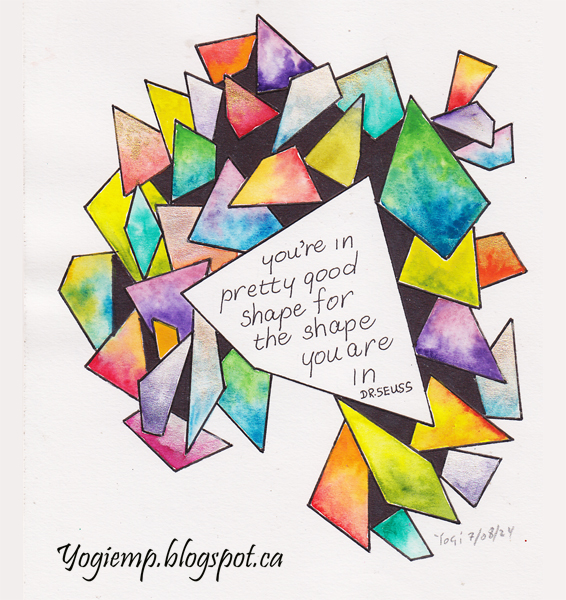 WC Quadrilateral - For The Shape You Are In Created: August 8, 2024 size: 5.5"w x 7"h OK now I've done circles and squares so thought I'd do quadrilaterals... Triangles should be coming next... Done on Canson Mixed Media paper. Drew out the center large quad for my text. Then drew all the other quads again with the extra fine point Sharpie... Painted with various brands of watercolors (W/N, Holbien. Grumbacher exe...) Text written with Zig Writer. words: You're in pretty good shape for the shape you are in. Dr Seuss |