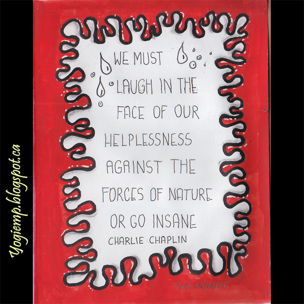 size: 6"h x 4.5"w On Canson Pen and Ink paper created the splash type border with a ZIG Writer and painted with w/c adding white gel pen highlights. Text with a Juice Up pen in a monoline style. words: We must laugh in the face of our helplessness against the forces of nature or go insane. Charlie Chaplin