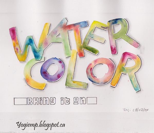 Watercolor - Bring It On Created: July 29, 2024 size: 7"w x 4.5"h Just playing outside again... Done on Arches 90# HP paper. Using a #6 Simply Simmons Chisel flat brush and various brands of watercolor. Wet each letter and dropped in my colors. Shadowed with a Zig Writer then with a graphite pencil and paper stump. Added the "Bring It On" with the Zig with an outline font. words: Watercolor Bring It On |